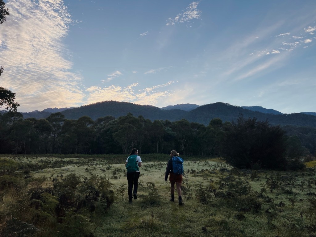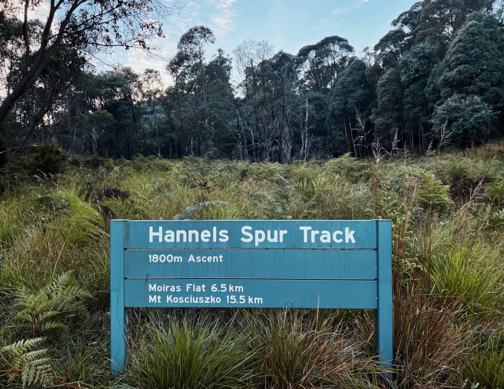 Waking up before sunrise at Geehi Flats Campground, we drove the car to the Doctor Forbes Hut access road to start our hike. A faint track drops down to the Swampy Plains River, where the chilly river crossing to Doctor Forbes Hut woke us right up. The trail starts out deceptively cruisy, weaving through the open grasslands of Geehi Flats. Roos bounced lazily across our path as we wandered the overgrown 4WD track, scanning the field until we finally spotted it: the weathered Hannels Spur sign, marking the official start of the climb.