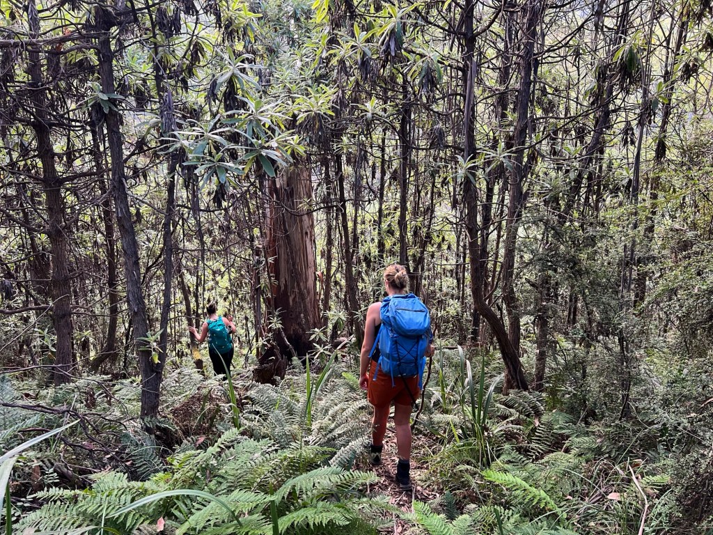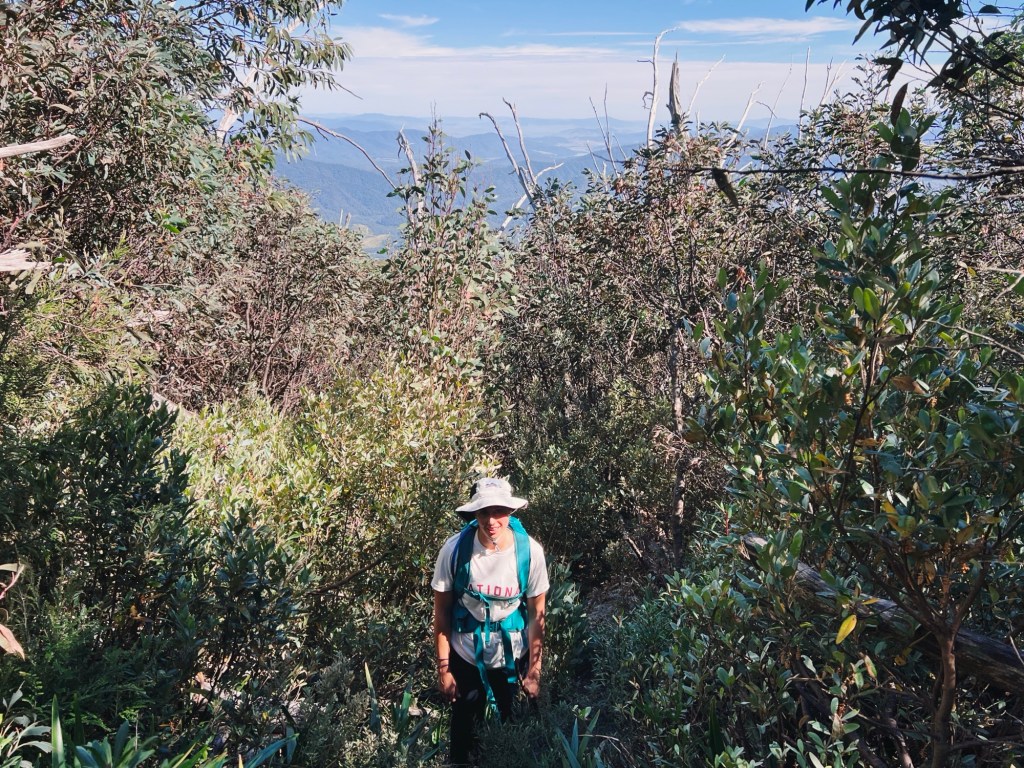 It ducks into thick eucalypt forest and starts climbing immediately. Tree roots tangled across the trail, and the track was barely marked, most signs long since swallowed by trees. Every now and then, the bush would part just long enough to offer a teasing glimpse of the valley we’d left behind. The gradient stayed brutal, and we crawled along at a pace of about one kilometre every half hour. Moira’s Flat was the perfect snack break, just a small grassy clearing big enough to set-up 3 tents. There’s water if you’re willing to scramble down for it, but we had enough to keep going. The climb, of course, was far from done.