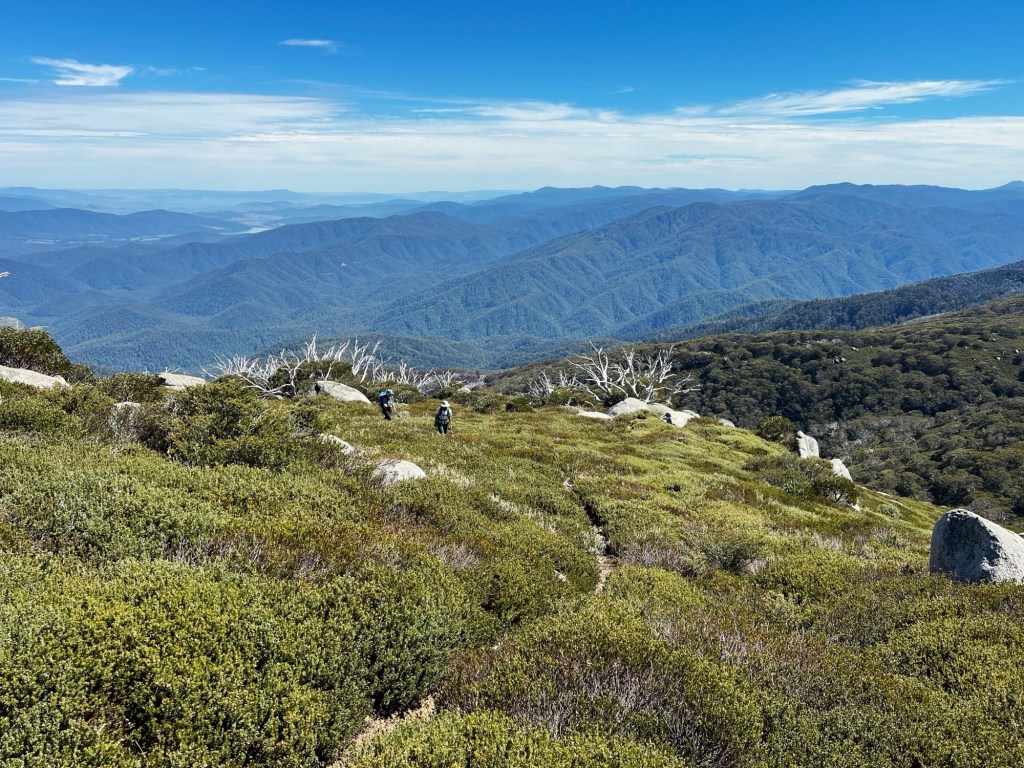 Our legs were weary, but the sight of the summit pulled us forward. Suddenly we were on the Main Range Walk, surrounded by more people than we’d seen all day. It was a strange change, after so many hours of solitude and sweat, we were dodging day hikers in jeans and thongs. Still, the summit felt bloody good. We found a quiet rock to sit on, took in the endless layers of mountains, and gave ourselves a moment to soak it all in. We’d earned every step.