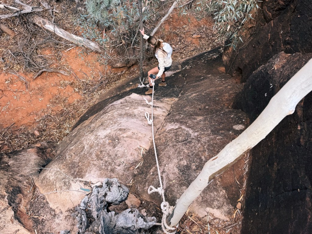 The trail backtracks slightly before climbing out of creek bed on the Bynguano Range Walking Track. The landscape changes with open ridgelines, and low hills. We crossed a few dry creeks, scrambled down boulders with the help of a fixed rope, and squeezed through a narrow slot that made me question if I could even fit.