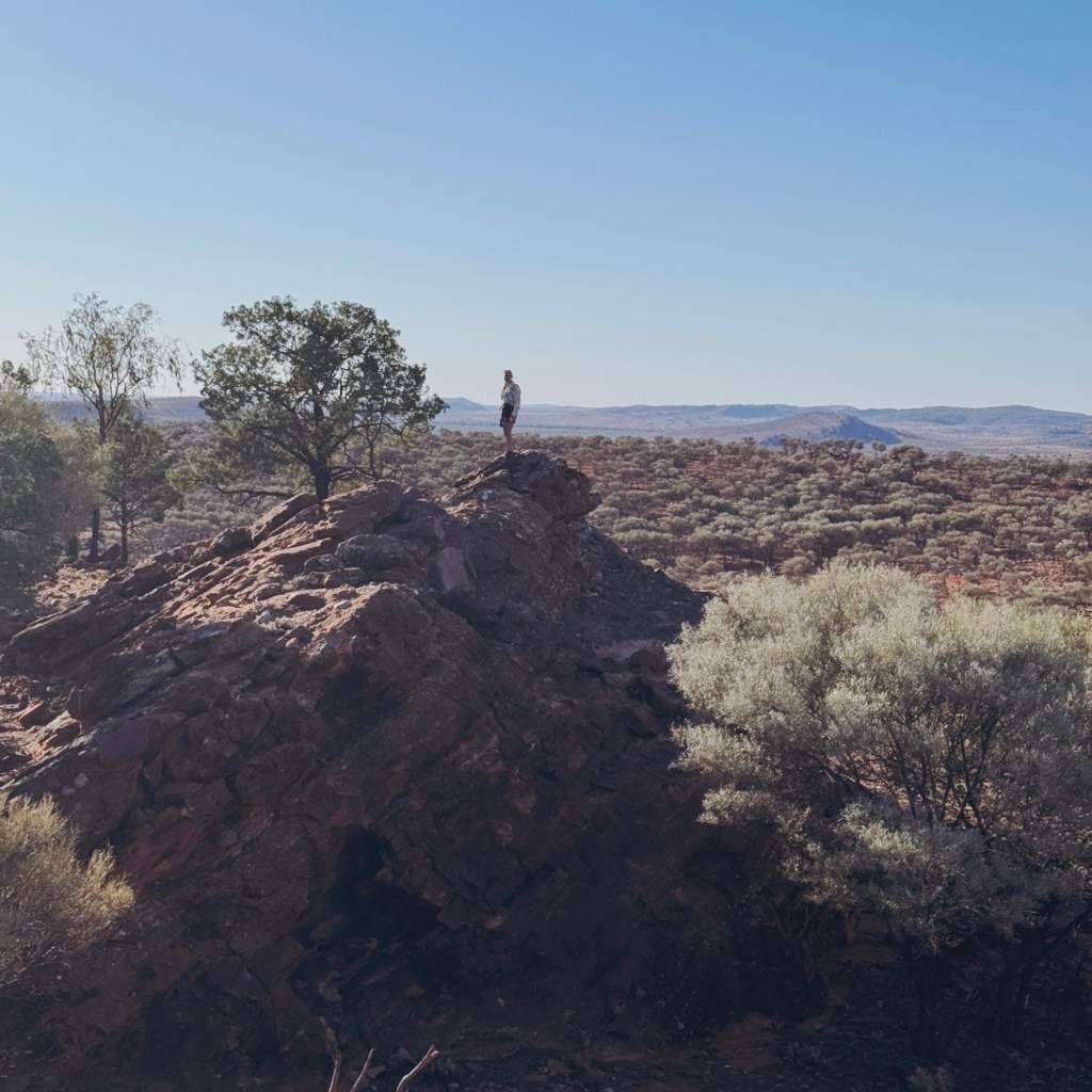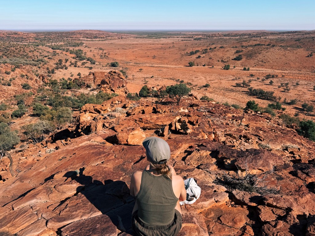 We started this one near the campground entrance and walked it clockwise. The trail runs beside the road, crosses over, and through a fence into the open scrub. It climbs steadily up a spur, passing a few Aboriginal drawings carved into a rock along the way. About halfway up, there’s a west-facing lookout that would absolutely hit at golden hour.