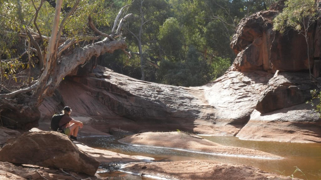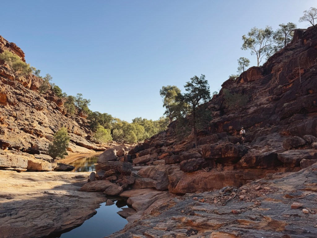 The trail starts out mellow, following a 4WD track before dropping into a dry creek. As the gorge walls close in, the scenery turns it up a notch. Towering walls rise on either side, there’s a bit of rock scrambling, and scattered pools begin to appear. Eventually, the trail leads to a narrow crack in the gorge where a large waterhole sits at the base of the amphitheatre.