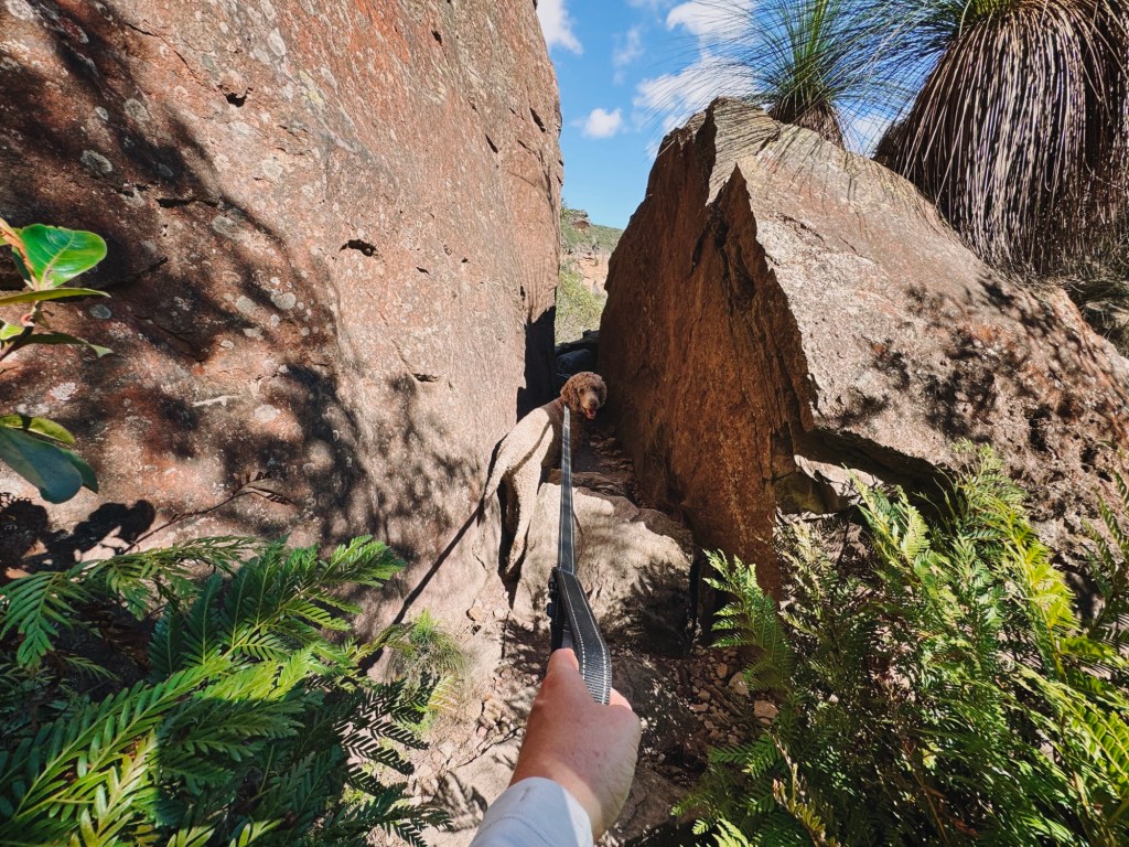 Starting at the end of Mount Piddington Road, the trail immediately drops into a steep, mossy pass with some tight switchbacks. Along the way, you’ll come across a sweet little waterfall (complete with a picnic table) nestled into the rocks. The track skirts around the cliff base, under some overhangs where views open out to the valley below. Through here there was a rocky ledge where I had to lift Bowie down as it was just too high for him to jump (large dog owners beware).