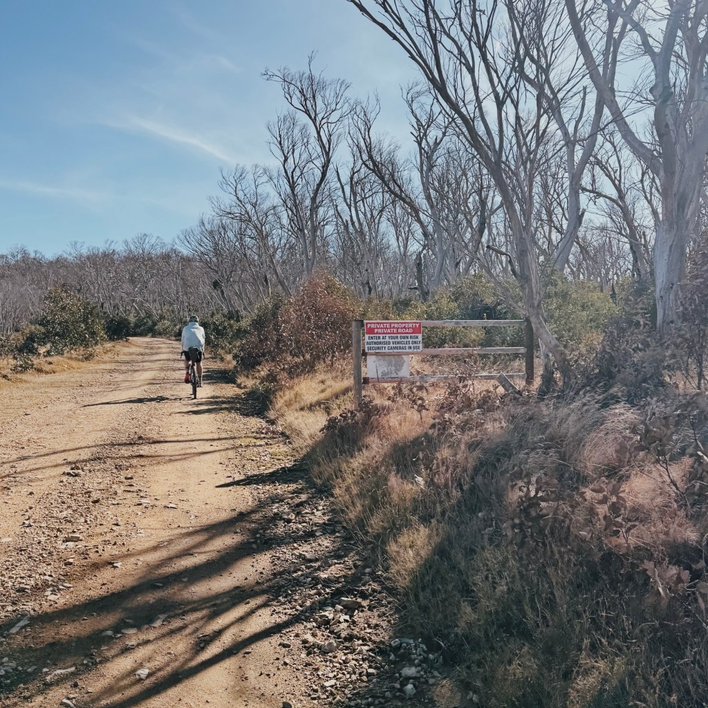 Beyond the gate is private access road. Pushbikes (not motorbikes) and hikers are welcome, but public vehicles are not. Even if you see the gate open, don’t drive through. Stay on the road, ride past the private property, and respect the landowners.
