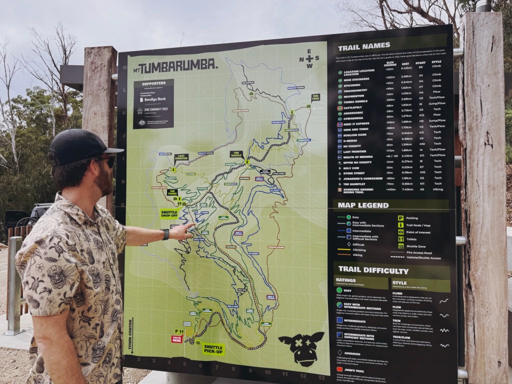 The park has a total of 22km of trail, with roughly 315m of elevation. Majority of the riding is on the western side of the mountain, with most of the trails funnelling back into ‘Tumba Rumble’. There is an extra 8km of hiking trails for those wanting a break from the bike.