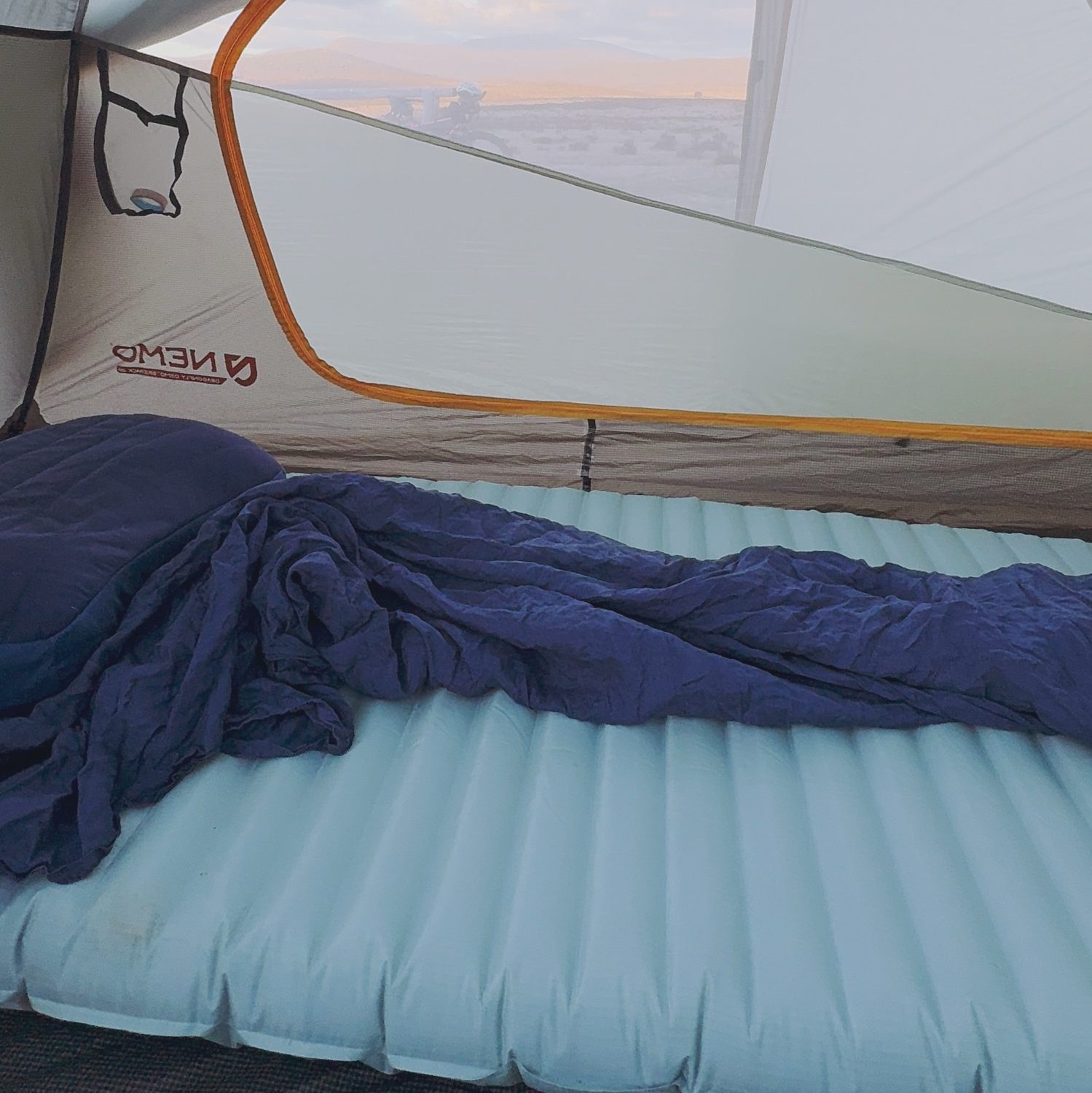 The new version packs down to just a bit bigger than a Nalgene, which makes bikepacking trips way more manageable: one person carries the mat, the other the quilt.